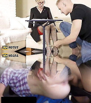 TUTOR4K. Schoolgirl roughly drills submissive blond teacher on the couch