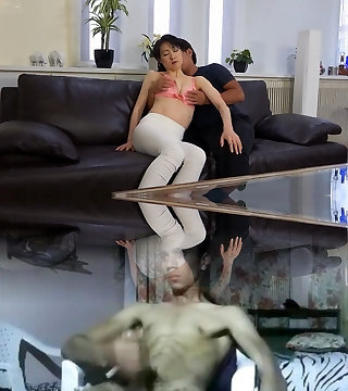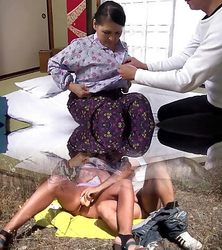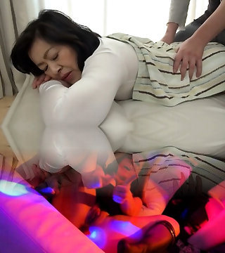 Moaning petite Asian mature lady takes his sperm inwards of her labia