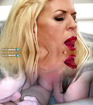 Bosomy platinum-blonde mommy lets a guy gobble her feet and toes