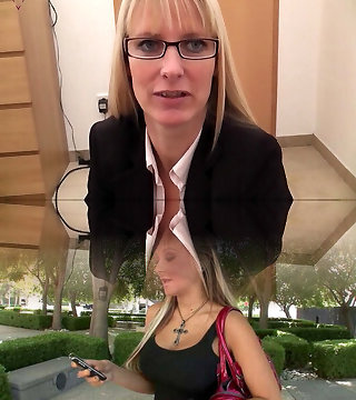 A lil' platinum-blonde teen lesbian with pierced tongue gives a proper licking to her mature gf with glasses