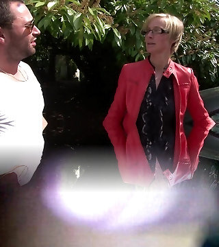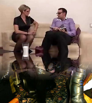Sexy and busty German cougar secretary with glasses and an ugly guy