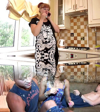 Orgy with a knocked up mature and three men