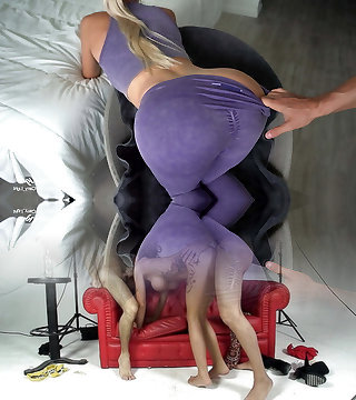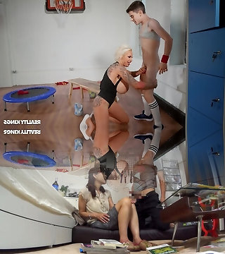 To burn off calories the ambisexual blonde mummies with fake tits have a sweaty three-way in the gym