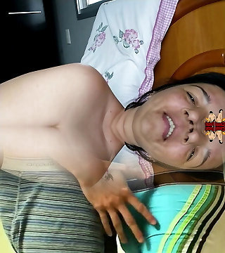 She flashes her trimmed Asian honeypot for him to eat it and cumshot on it