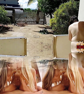 Wife teasing cuckold husband. She jacks him and goes nude outside.