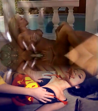 Spooky mask intimidates the curvy milfs so they get payback with a hard-core threesome