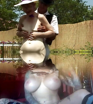 Naughty busty BBW mature wife plays with faux-cock on summer day