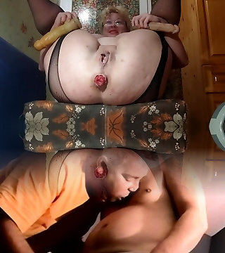 Altes Fickvieh pisst mit Riesendildo im Arsch